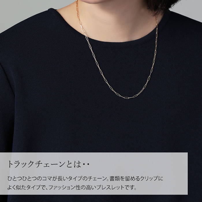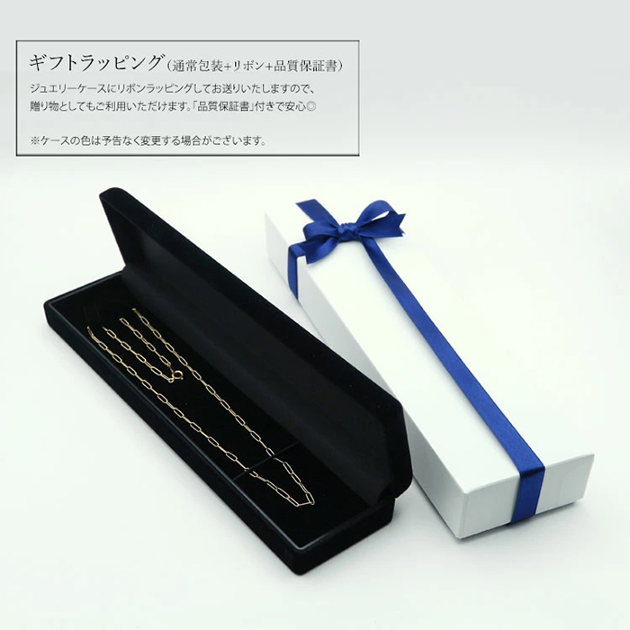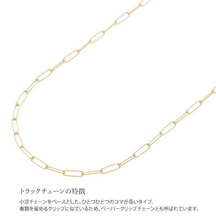 定番デザインのあずきチェーンに、ひとつひとつのコマを少し長めにアレンジしたタイプ。書類を留めるクリップによく似ているため、ペーパークリップチェーンとも呼ばれています。軽やかな着け心地ながら、しっかりとした存在感を備えており、コーディネートに程よいボリュームをプラスします。