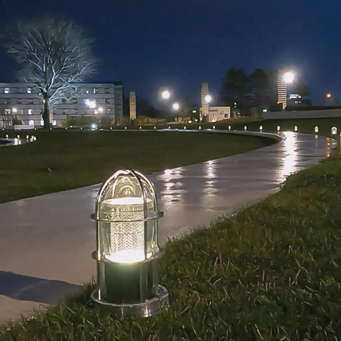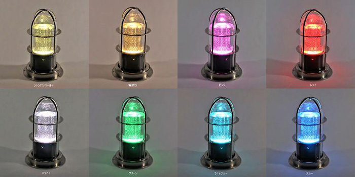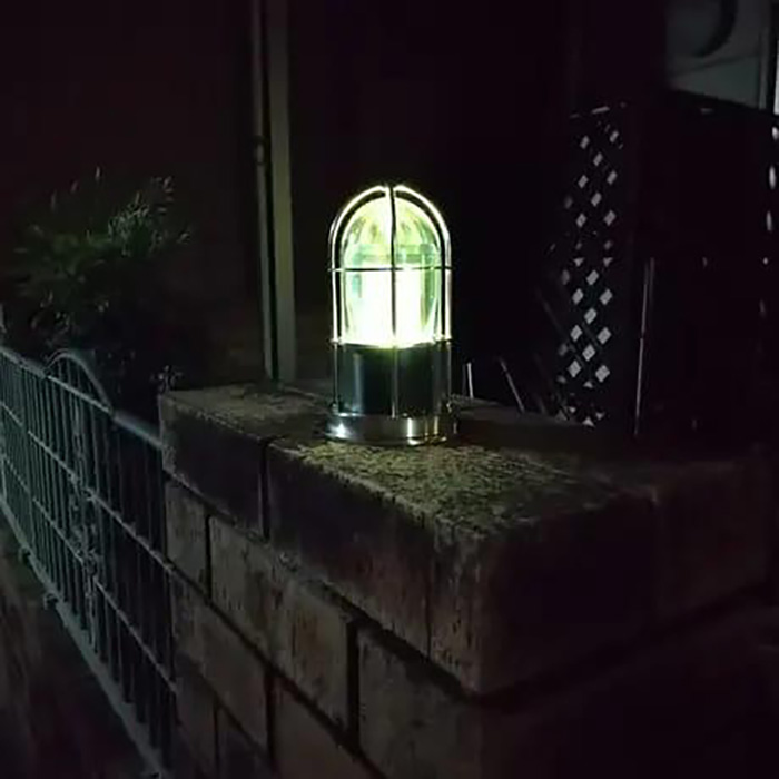 全方位から光をキャッチできる粒状の球状太陽電池を利用し、LED、バッテリーガラスグローブ、外枠が一体になったソーラー式マリンランプ。高い防水性、耐久性、耐寒性、高い信頼性の野外マリン仕様。照明部はLEDの光を球状太陽電池に当てる間接照明式。昼間蓄えた電気で、夜は約4時間の自動点灯。長寿命のLICバッテリー採用でメンテナンスフリーを実現。LED発行色の初期設定はシャンパンゴールド色。設置場所に合わせ内部のスイッチで8色から、雅な色合いに情景を考えながら変えることが可能。