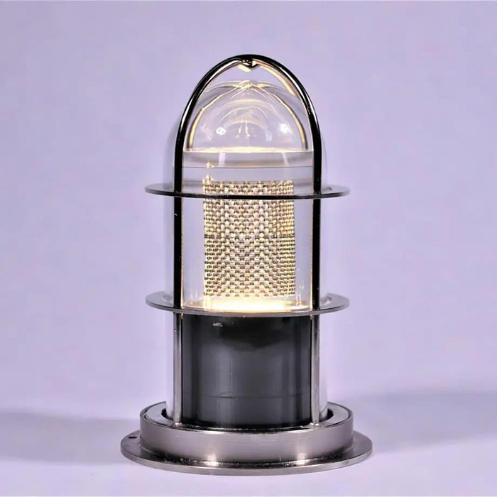 スフェラーマリンランプは水没試験でガラス風防内部に水の侵入がないことを確認しておりますが、あくまでも防雨型です。防湿型ではありません。風防ガードが取り外し可能なねじ込み構造のため、しっかりと組立てることが必要です。確実な防水性を確保するためには、ねじ込み部分に使用環境に合わせた市販のシール剤を塗って組立てることを強く推奨致します。なお、ねじ込み組立て不備による不具合につきましては保証できませんので、ご了承願います。万一内部結露が発生した場合は、適時、拭き取りをしてお使い下さい。なお、温泉地域など特殊な環境で数多く使用の場合はプロ仕様で対応致します。別途弊社HPなどからお問い合わせ下さい。
