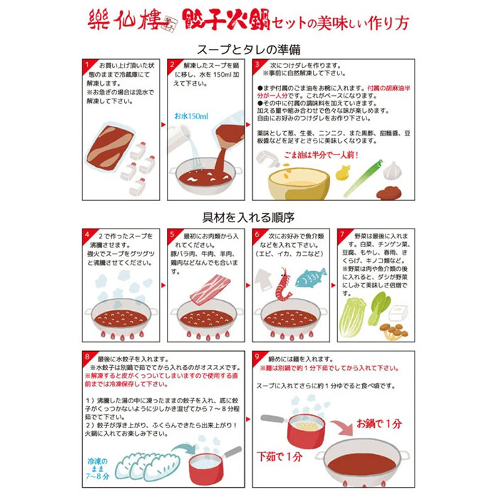 コクのある辛さで人気の辛湯スープに楽仙樓名物の水餃子とシメの麺をセットにしました!