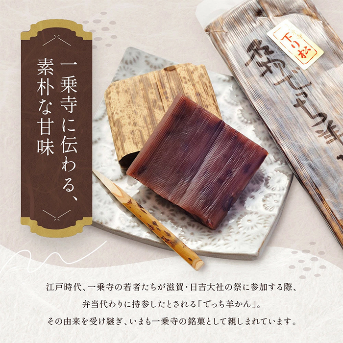 江戸時代より一乗寺村の若人衆が滋賀の日吉大社の祭の輿かきに出向いた際、弁当がわりに用いたのが「でっち羊かん」の起こりと伝えられております。