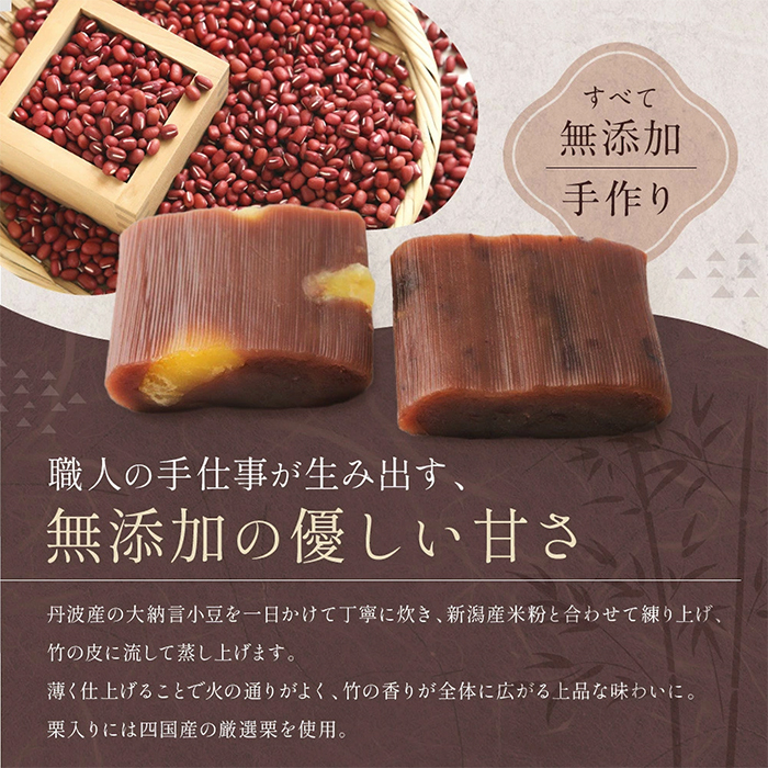 今日でも「丹波地元より直接仕入れた大納言小豆を使い、あっさりとした高級白双糖で粒あんを作り米粉と練り合わせ、竹の皮に流して蒸し上げる」という伝統の製法を守っています。