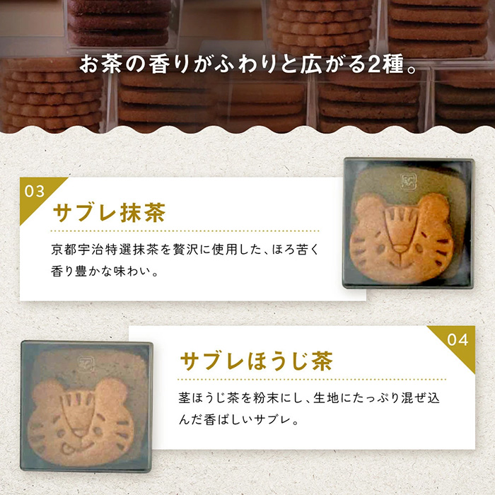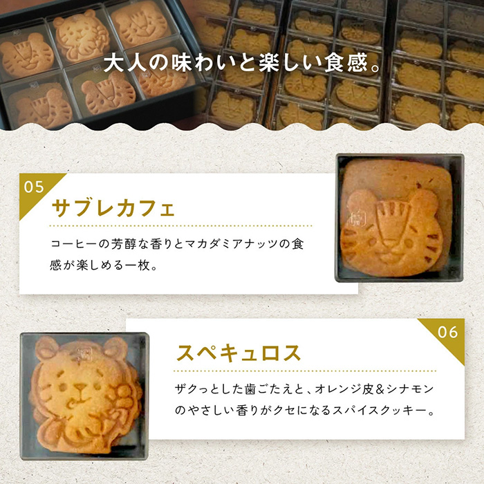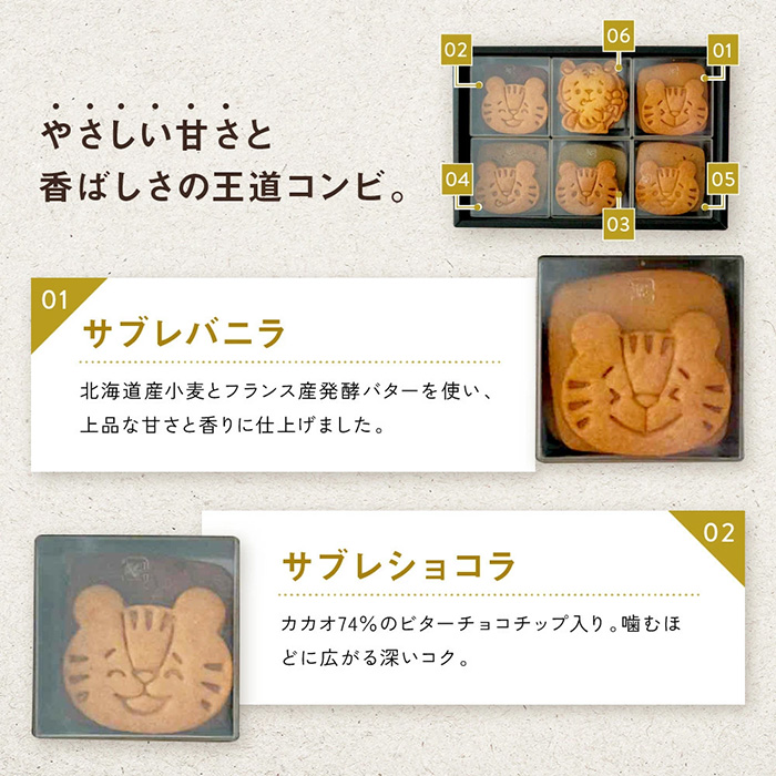 とらちゃんクッキーのお顔は6種類です。お顔に合わせてサブレと一緒に小さな筒に詰め、ピッタリサイズのオリジナルブラックボックスに6種類すべてを詰め合わせております。