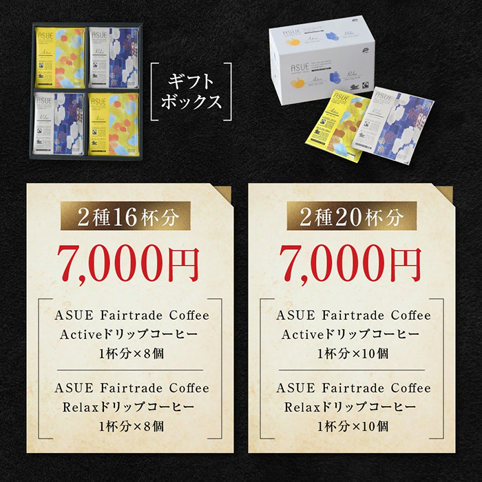コーヒーづくりの基盤である地球環境や生産者の暮らしを守っていくこと。「一杯のコーヒーからできること」を体現した「ASUE Fairtrade Coffee」。Active、Relaxの2種類の味わいのブレンドを詰め合わせたドリップコーヒーギフト・セットです。