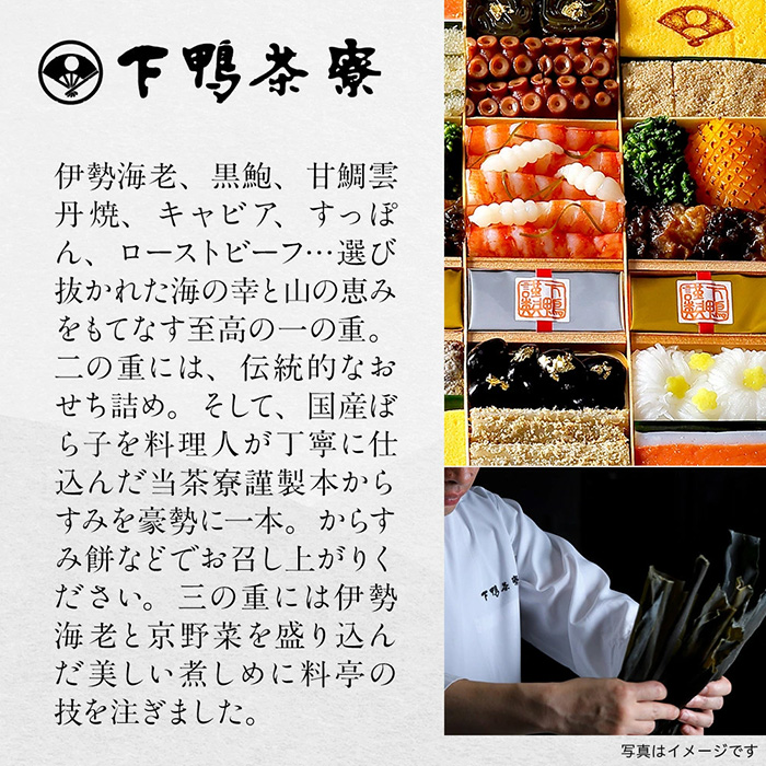二の重には、伝統的なおせち詰め。そして、国産ぼら子を料理人が丁寧に仕込んだ下鴨茶寮謹製本からすみを豪勢に一本。からすみ餅などでお召し上がりください。さらに、伊勢海老と京野菜を盛り込んだ美しい煮しめに料亭の技を注ぎました。