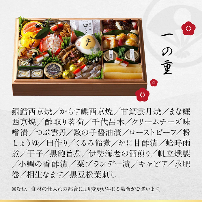 銀鱈西京焼、からす鰈西京焼、甘鯛雲丹焼、まな鰹西京焼、酢取り茗荷、千代呂木、クリームチーズ味噌漬、つぶ雲丹、数の子醤油漬、ローストビーフ、粉しょうゆ、田作り、くるみ飴煮、かに甘酢漬、蛤時雨煮、干子、黒鮑旨煮、伊勢海老の酒煎り、帆立燻製、小鯛の香酢漬、栗ブランデー漬、キャビア、求肥巻、相生なます、黒豆松葉刺し