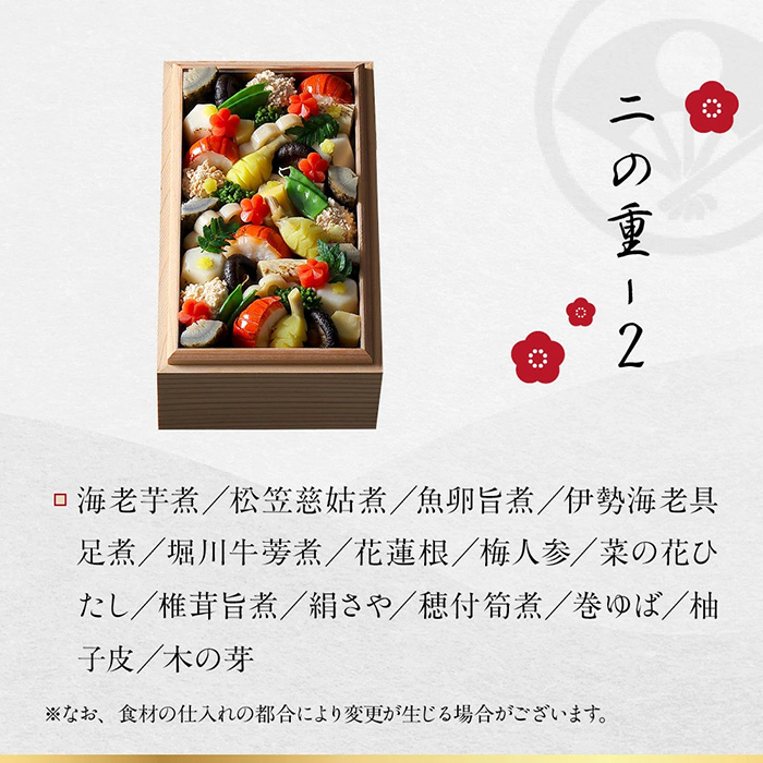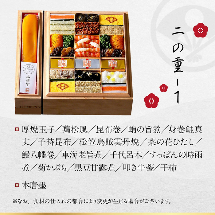 厚焼玉子、鶏松風、昆布巻、蛸の旨煮、身巻鮭真丈、子持昆布、松笠烏賊雲丹焼、菜の花ひたし、鰻八幡巻、車海老旨煮、千代呂木、すっぽんの時雨煮、菊かぶら、黒豆甘露煮、叩き牛蒡、干柿