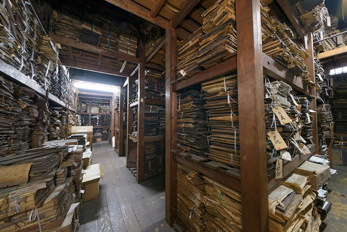 京都本店の奥にある版木蔵には、数万枚に及ぶ版木が積み上がります。代表的な出版物に、葛飾北斎『富嶽百景』・『北斎漫画』、神坂雪佳『百々世草』があります。