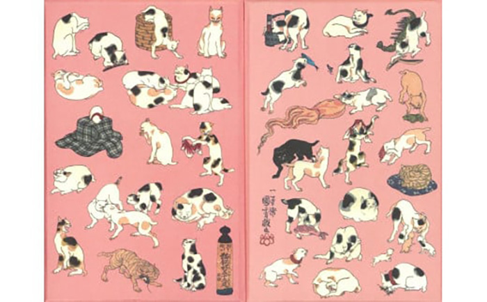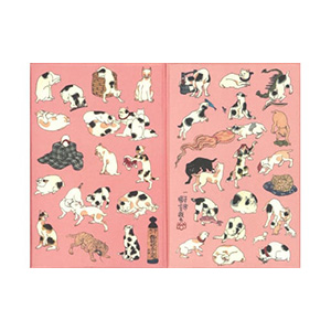 猫好きで知られた浮世絵師・国芳の猫飼好五拾三疋(みゃうかいこうごじゅうさんびき)」を表紙に仕立てました。東海道の五十三の宿駅に日本橋と京都を加えた五十五の地口(語呂合わせ)で、様々な猫たちの姿が描かれています。