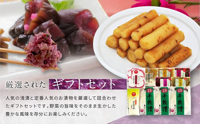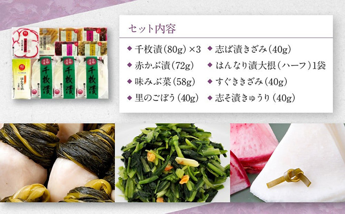 千枚漬(80g)×3、赤かぶ漬(72g)、志ば漬きざみ・すぐききざみ・志そ漬きゅうり(各40g)、はんなり漬大根(ハーフ)(1袋)、味みぶ菜(58g)・里のごぼう(40g)