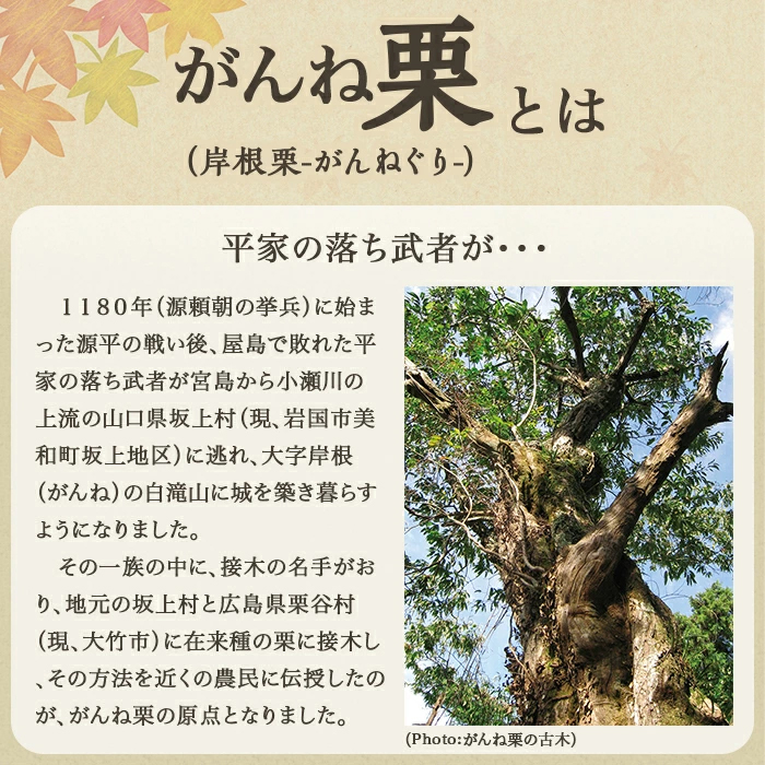 そんな中でも、特に美味しいと言われる河平(こうひら)産のがんね栗の栗きんとんです。