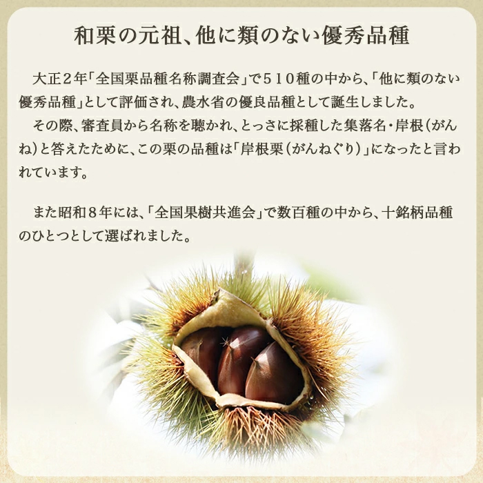 その大きさだけでなく、深い甘味とまろやかな肉質を誇る「がんね栗」を無添加で、少量の砂糖(グラニュー糖)だけを練りこんだ、風味豊かな栗きんとんの「がんね栗衛門」