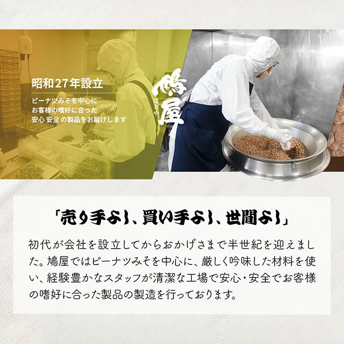 「売り手よし、買い手よし、世間よし」といった「三方良し」の理念に基づき、初代が会社を設立してからおかげさまで半世紀を迎えました。鳩屋ではピーナツみそを中心に、厳しく吟味した材料を使い、経験豊かなスタッフが清潔な工場で安心・安全でお客様の嗜好に合った製品の製造を行っております。
