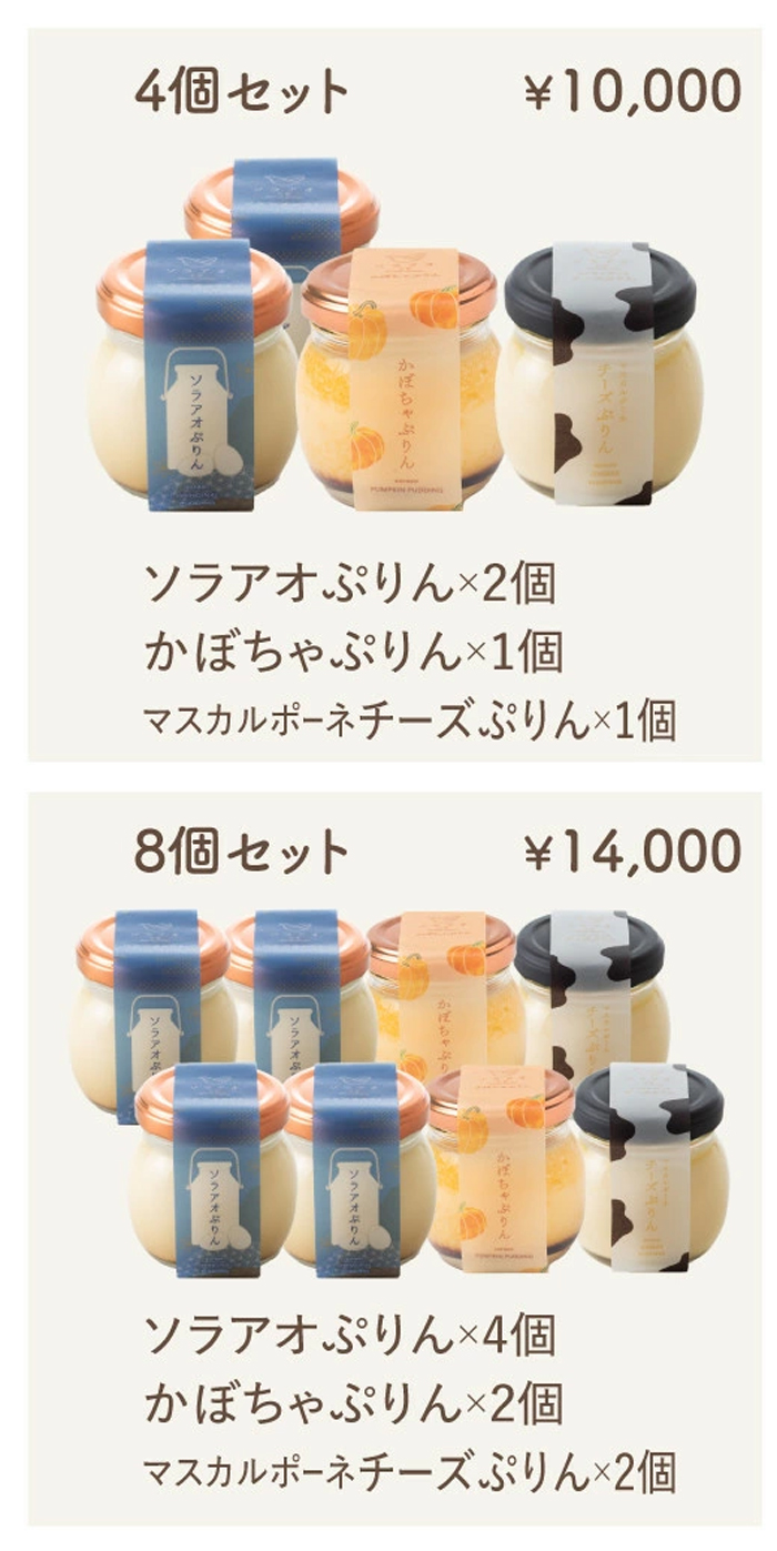 ・8個セット ソラアオぷりん(プレーン)×4個、かぼちゃぷりん×2個、マスカルポーネチーズぷりん×2個