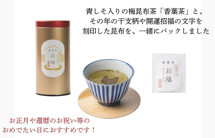 梅昆布茶にその年の、干支の絵や文字を刻印した昆布を一緒にパックをした商品との詰合せです。1杯分ずつに仕上げております。
