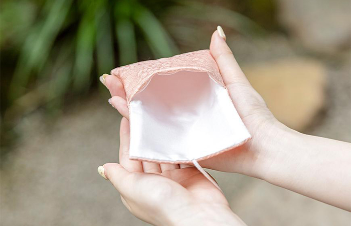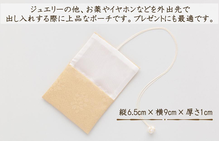 ジュエリーの他、お薬やイヤホンなどを外出先で出し入れする際に上品なポーチです。
