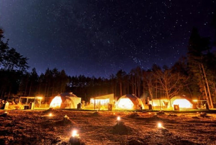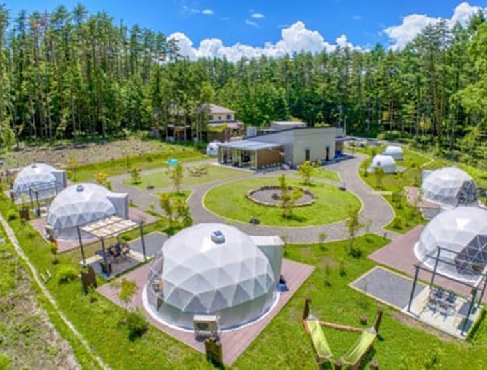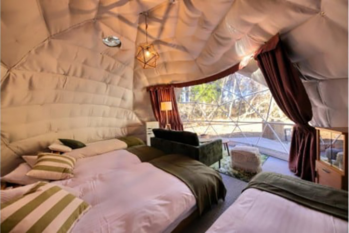 ドーム型のテントは5棟で冷暖房完備で冬も夏も一年を通じて快適に過ごすことができます。