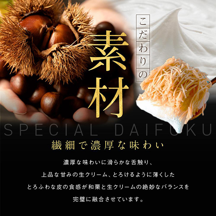 もちもちとろけるような大福は毎日手作り。皮はとろけるような感覚になるように薄くしていきます。この大福のとろふわ食感が、和栗と生クリームの絶妙なバランスを完璧に融合させています。