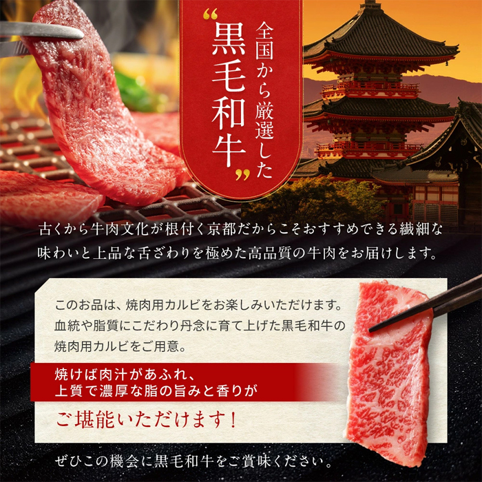 京都食肉市場で購買し、選りすぐった国産黒毛和牛。焼けば肉汁あふれるバラ肉(カルビ)を焼肉用に仕上げました。