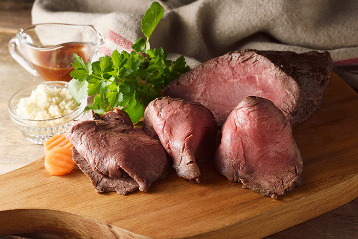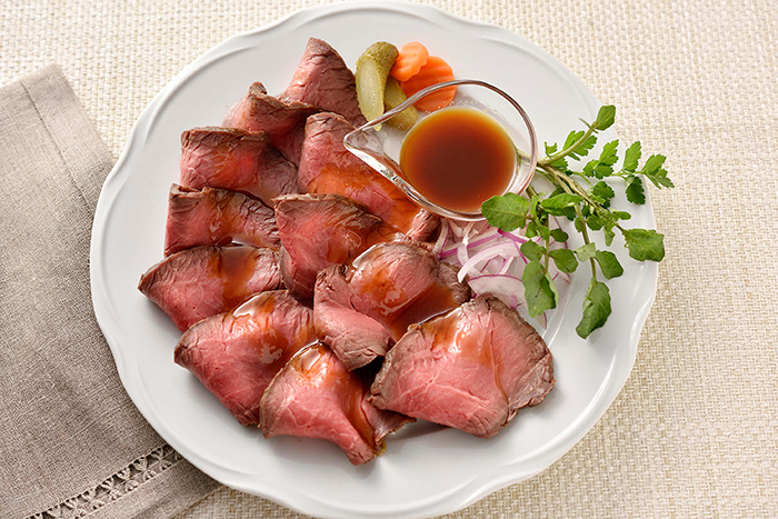 ローストビーフ:原材料の牛もも肉は北海道産で原材料の98.77%を占める。