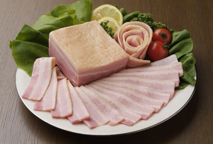 ベーコン:原材料の豚ばら肉はEU産で原材料の80%を占める。