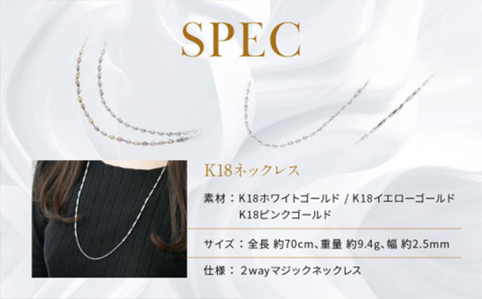 ホワイトゴールドの上品な輝きと、ホワイトゴールドをベースに、イエローゴールドとピンクゴールドを加えた色鮮やかなマルチカラーという、2つの相反した表情を有するネックレス。