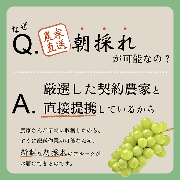 農家さんの朝採れシャインマスカットを新鮮な状態のままお客様の元にお届けします。