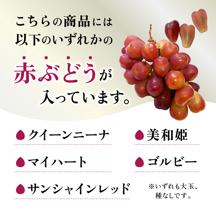 大人気のシャインマスカットと山梨を代表する赤系ぶどうのクイーンニーナ、マイハート、サンシャインレッド、三輪姫、ゴルビーのいずれか入ったフルーツ詰め合わせセットをお送りします。