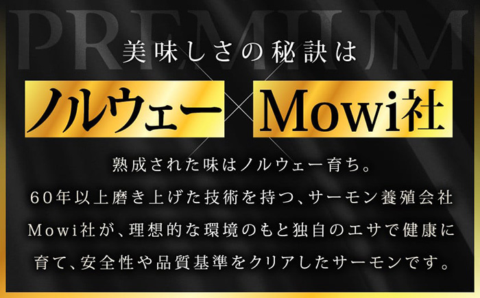 サーモンの養殖を60年以上行い、技術を磨き上げたノルウェーのMowi社は、色、品質、脂のりなどの基準をクリアしたもののみを提供します。