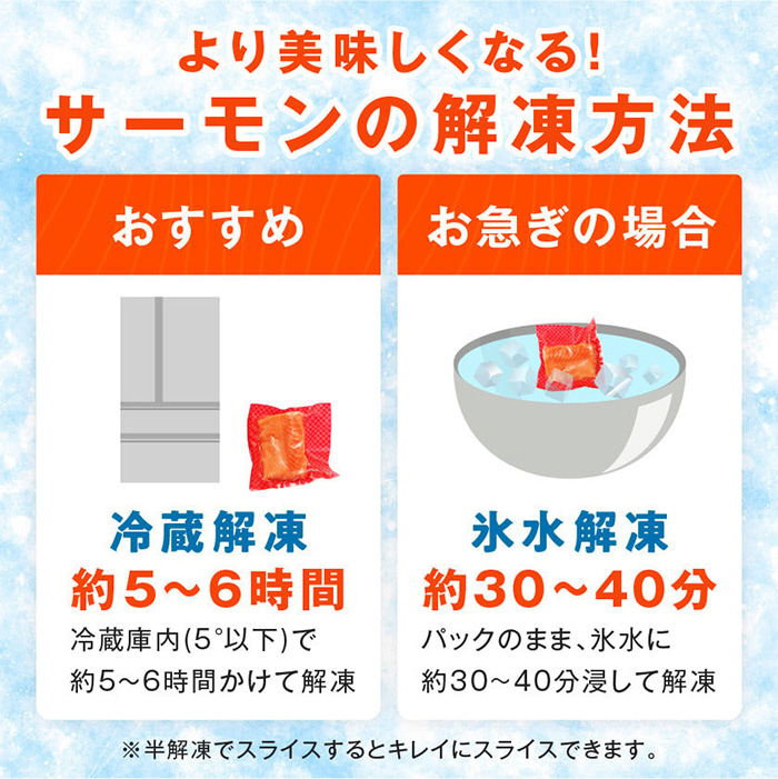 ※ドリップが出やすく、食感や風味が損なわれる可能性がありますので、常温解凍・電子レンジ解凍は避けてください。