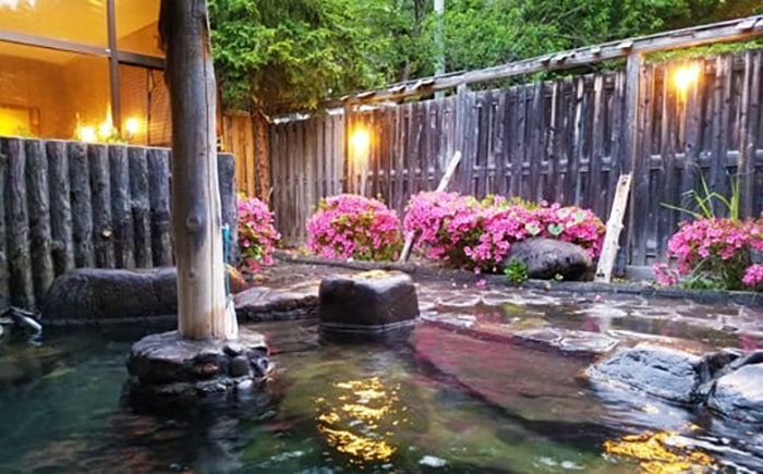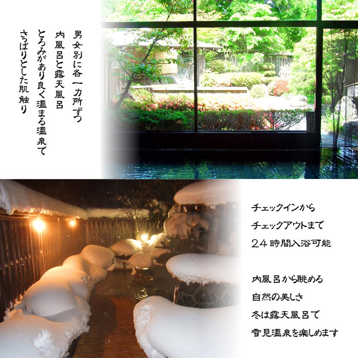 季節ごとの草花や紅葉、雪見が楽しめる庭園露天風呂は24時間入浴可能。
