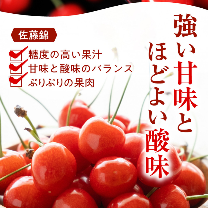 さくらんぼの王様「佐藤錦」を通常より早く味わえます。無加温ハウスで育った、最高級の味をご賞味あれ!
