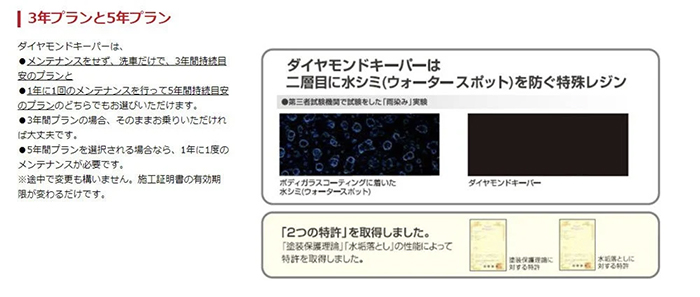 ダイヤモンドキーパーは3年間ノーメンテナンス(1年に1回のメンテナンスで5年耐久)です。