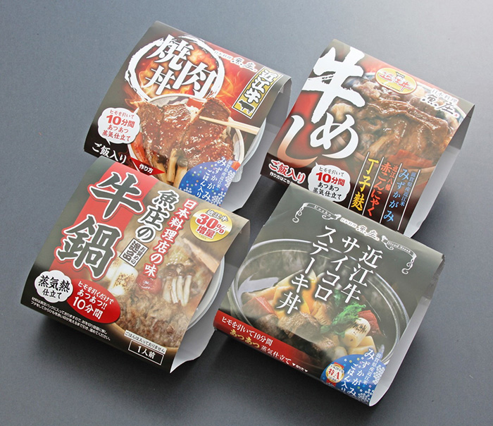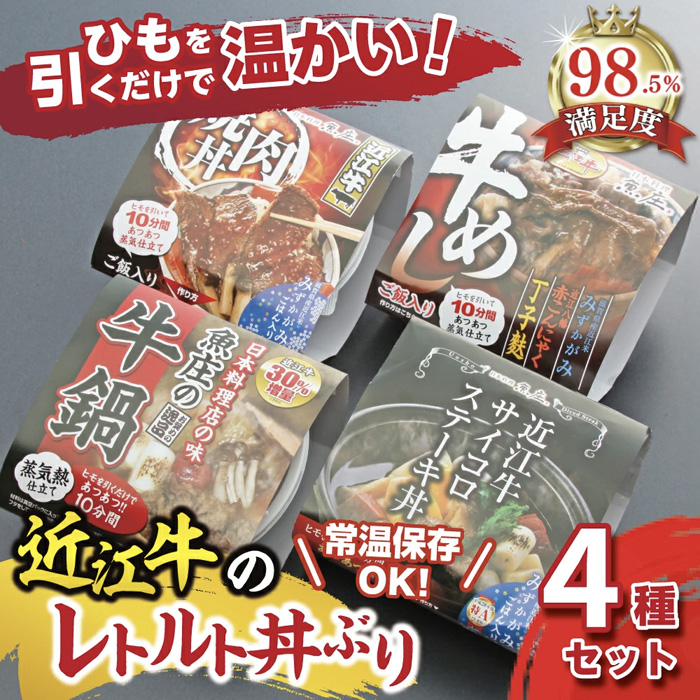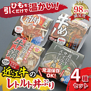 近江牛、赤こんにゃく、丁子麩、特A近江米を一つにまとめ、最強の近江八幡名産品に仕上げました。牛めし、焼肉丼、サイコロ煮込み丼、牛鍋(御飯なし)と4種類のセットをお届けいたします。魚庄のみのアイデア商品です。味はレトルト食品の域を超えた逸品です。是非ともお求めください。