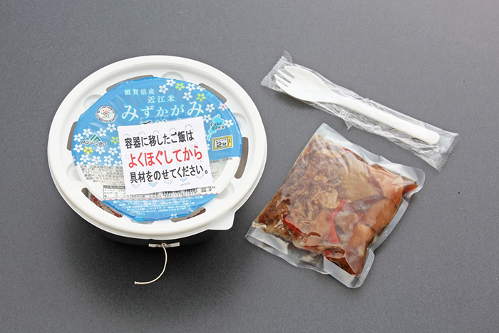 あつあつに出来る使い捨て容器に180日常温で保存できるレトルト食品をセットしてあります。