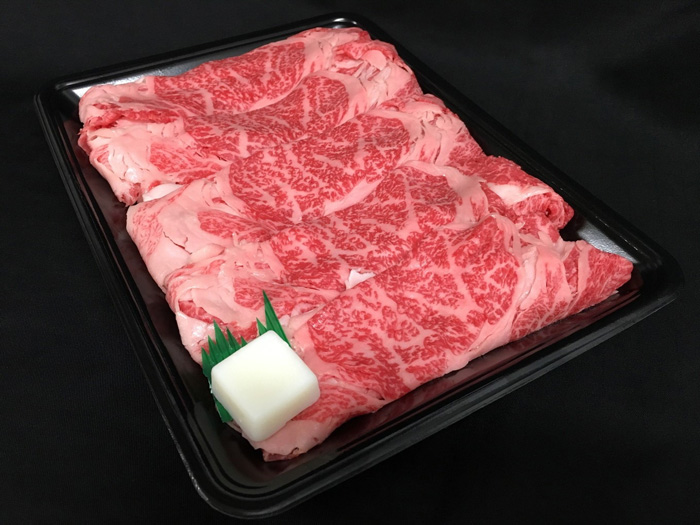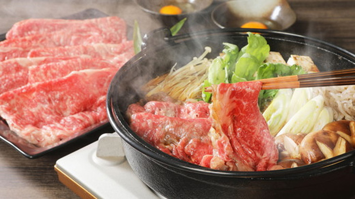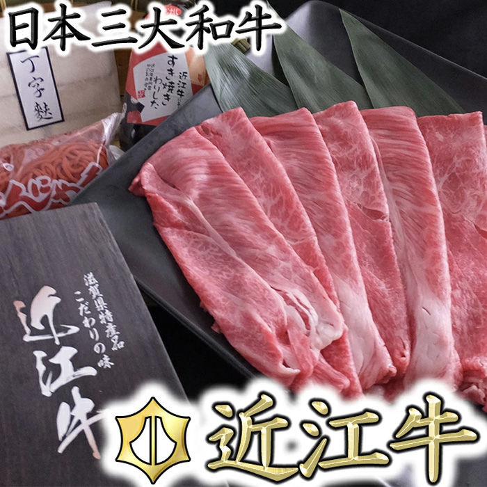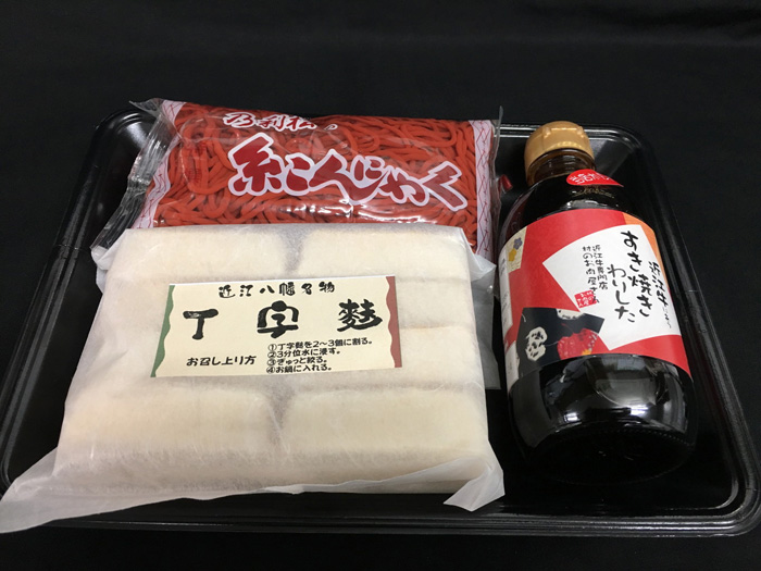 近江牛のすき焼き用と近江八幡名物「丁字麩」「赤こんにゃく」そして当店オリジナルわりしたをセットにしております。