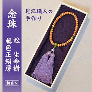 聖徳太子伝授と伝わる伝統の技を受け継ぐこの近江八幡の地で、職人がひとつひとつ丁寧にみかん玉に挽き上げた珠は、[松]の美しさを存分に楽しめると共に女性らしい愛らしさが魅力です。「命を司る樹」との意味を持つ深緑色の希少銘木[生命樹]を艶やかに仕上げて合わせた大変美しい念珠です。