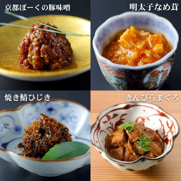 ・6種:京都ぽーくの豚味噌110g、明太子なめ茸100g、焼き鯖ひじき55g、きんぴらまぐろ120g、京のぜいたく牛しぐれ70g、昆布ふりかけ60g
