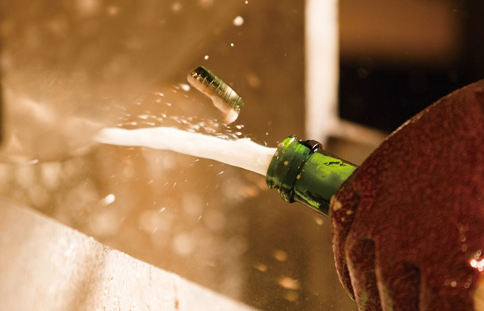 熟成期間中は瓶を横に寝かせ、出荷前には澱を取り除く作業を行います。瓶を1/8ずつ回転させながら澱を瓶口に集め、-22〜-23℃の冷媒で凍らせて抜き取るという、熟練の技が光る工程を経て、辛口でエレガントな味わいに仕上がります。