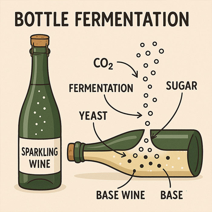 瓶内二次発酵とは、出来上がったワインに糖分と酵母を加えた後、一緒に瓶詰めし、酵母働きによって炭酸ガスを発生させる手法です。