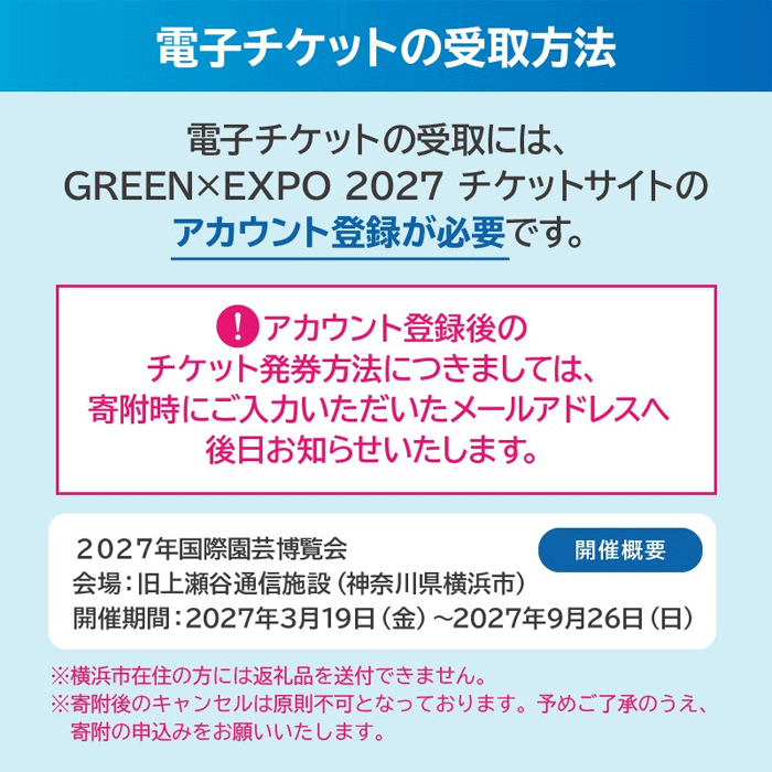 地場産品に該当する理由 横浜市で開催されるGREEN×EXPO 2027(2027年国際園芸博覧会)への入場チケットであり、本市と相当程度の関連性があるといえる。