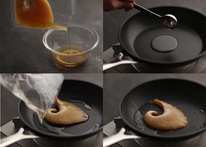 3.フカヒレをフライパンにいれてから火を付け、中火で焼いていきます。