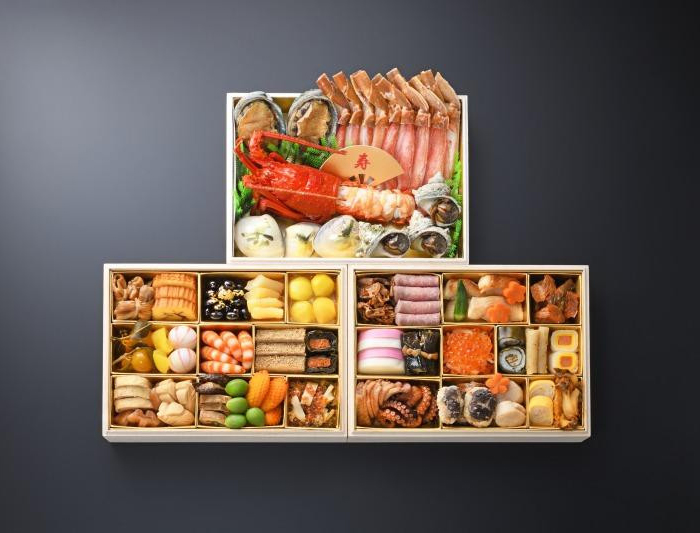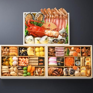 牛肉時雨煮、ローストビーフ、カラス鰈味噌幽庵焼、梅人参、割烹オクラ、鱈旨煮、紅白蒲鉾、鰊昆布巻、紅白なます、いくら醤油漬、龍飛巻、たたきごぼう胡麻和え、サーモン砧巻、合鴨燻製、蛸照焼、陣笠椎茸片栗揚、帆立貝柱、錦糸玉子巻、練り雲丹鮑