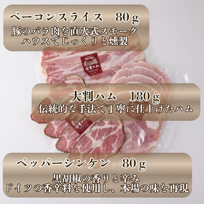 豚肉に直接職人の手で塩、スパイスを擦り込み、2週間以上熟成させ、直火式スモークハウスでじっくり燻製したハムと清流「菅野川」の伏流水で仕込んだ自慢のウインナーをお届けします。