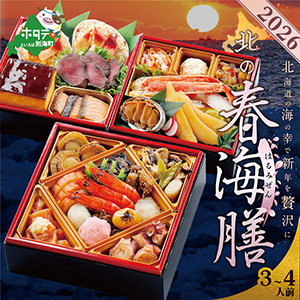 目にも美しい彩りと満足感を兼ね備えた人気の3段重お膳と、北海道産の絶品「野付産ほたて」または「野付産味付数の子」が付いたボリューム満点なセットとなっています。