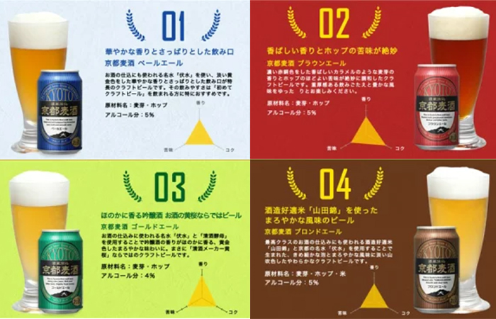華やかな香りとサッパリした「京都麦酒 ペールエール」、濃い赤銅色した香ばしい麦芽の香りとホップの良い苦味が絶妙な「京都麦酒 ブラウンエール」、清酒酵母を使用し、吟醸の風味がフワッと香る「京都麦酒 ゴールドエール」、最高クラスのお酒に使われる酒造好適米「山田錦」を使用した「京都麦酒 ブロンドエール」の4種類アソートパックが6セット入っています。