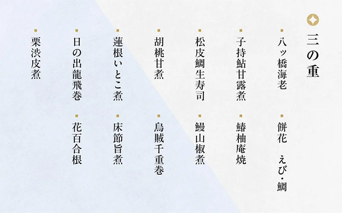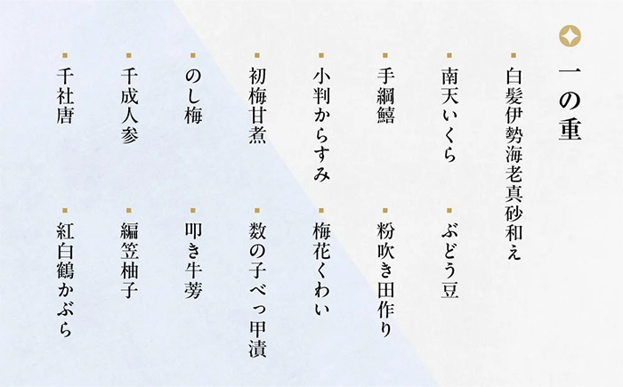 白髪伊勢海老 真砂和え、南天いくら、ぶどう豆、手綱鱚、粉吹き田作り、小判からすみ、梅花くわい、初梅甘煮、数の子べっ甲漬、のし梅、叩き牛蒡、千成人参、編笠柚子、千社唐、紅白鶴かぶら