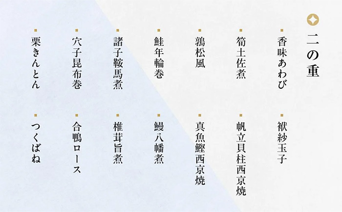 香味あわび、袱紗玉子、筍土佐煮、帆立貝柱西京焼、鶉松風、真魚鰹西京焼、鮭年輪巻、鰻八幡煮、諸子鞍馬煮、椎茸旨煮、穴子昆布巻、合鴨ロース、栗きんとん、つくばね