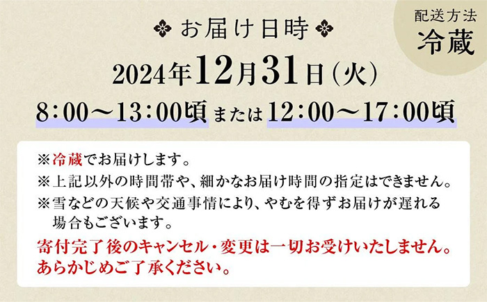 | 発送日 | 2024年12月31日8時〜13時頃または12時〜17時頃(日時指定不可) ※雪などの天候や交通事情により、やむを得ずお届けが遅れる場合もございます。 【お届け地域について】 ※お届け地域限定の返礼品です。返礼品詳細記載の【お届け地域について】をご確認の上、お申込みください。 |