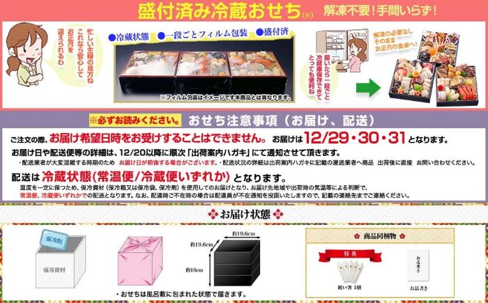 | 発送日 | 2023年12月29日・30日・31日お届け予定(日時指定不可) ※お届け日時や配送日の詳細は、12月20日以降に順次「出荷案内ハガキ」にて通知いたします。 ※天候や交通事情などにより、お届けに遅れが発生する場合がございます。あらかじめご了承ください。 |